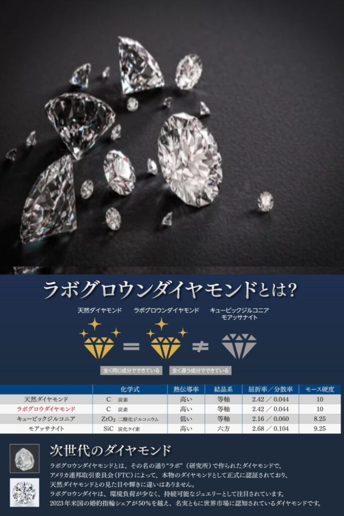 天然ダイヤモンドと同じ炭素構造を持ち、輝き・硬度・美しさに違いはない“本物のダイヤモンド”です。