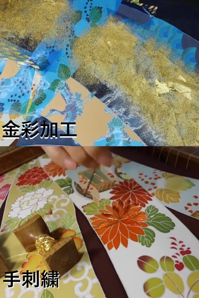 こうして、染め上がった生地に金・銀の箔や粉を使い、文様の一部に金彩をあしらい、華やかさを添えます。金くくりや押し箔・摺箔・砂子などの技法で京友禅ならではの美しさを表現します。さらに、絹糸・金糸・銀糸を用いた刺繍を施すことで、光沢や立体感による装飾効果が加わり、友禅模様はいっそう引き立てられます。