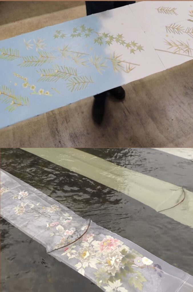 その後染色液を定着させるため蒸しの工程をし、蒸しが終わると生地に残った余分な料、薬剤や糊を完全に落とすために大量の水で洗い流します。
