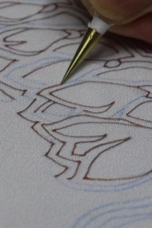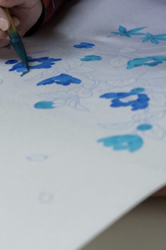制作工程では、まず青花(あおばな)と呼ばれる、水で洗い流すと落ちる色素を用いて、布地に下絵を描いていきます。