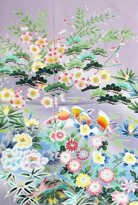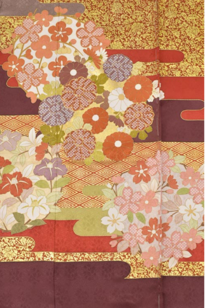 京友禅は、多色使いによる鮮やかで明るい色彩を特徴とし、見る者に華やかで豪華な印象を与えます。染めの技法に加えて、刺繍や金彩を組み合わせることで立体感と輝きが生まれ、その美しさはいっそう引き立てられます。