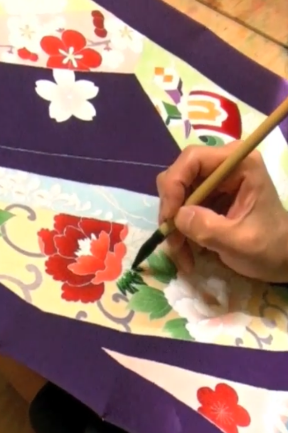 引染(ひきぞめ)は地染(じそめ)とも言われ、生地に染料液を刷毛で均一・または、ぼかして染めます。その後水洗いし糊や不純物を完全に落とし、筆と刷毛を駆使して絵模様部分に染料などで染色していきます。全工程の中でも最も高度な色彩感覚と創造性が求められる、友禅挿しと言われるこの工程は、友禅師それぞれの感性や個性が存分に発揮される、京友禅制作において極めて重要な工程です。