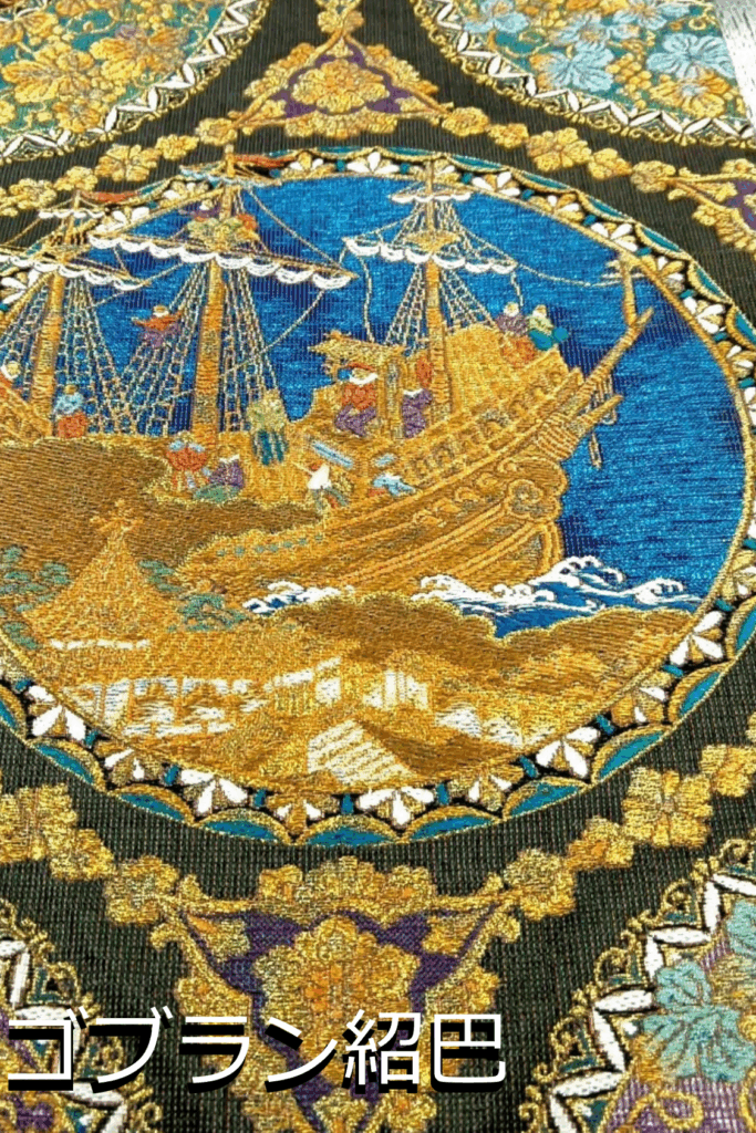西洋の室内装飾に用いられる「ゴブラン織」と、桃山時代より受け継がれる日本の伝統技法「紹巴織(しょうはおり)」を融合させた「ゴブラン紹巴」は、重厚さと繊細さが見事に調和した逸品です。