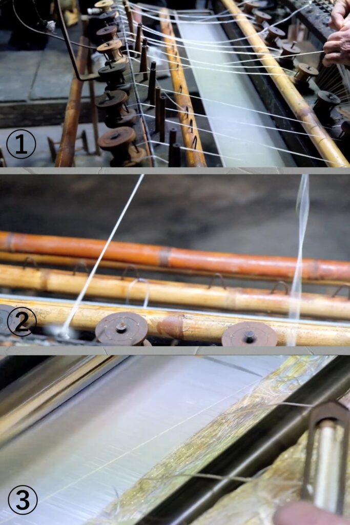 ②さらに、下撚りを施した糸4本を合わせ、熟練の職人が絶妙な回転数で調整しながら上撚りをかけていきます。職人が糸の撚り具合を微妙に調整しながら織り上げることで、まるで琴の音色のように調和のとれた風合いが生まれます。その後、草木染によってやわらかな色合いに染め上げられた糸は、次の製織工程へと進みます