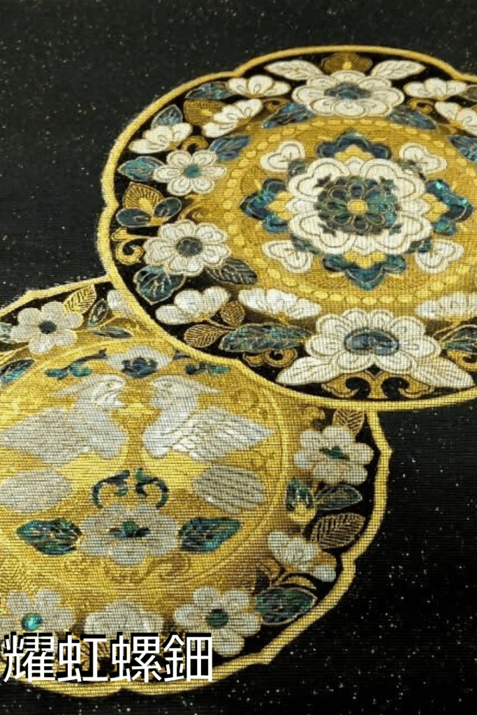 さらに、白蝶貝や孔雀貝を螺鈿(らでん)技法で織り込み、光彩のきらめきを優雅に表現した「耀虹螺鈿(ようこうらでん)」は、西陣織ならではの高度な技術と美意識が息づく、華麗で存在感のある帯となっています。