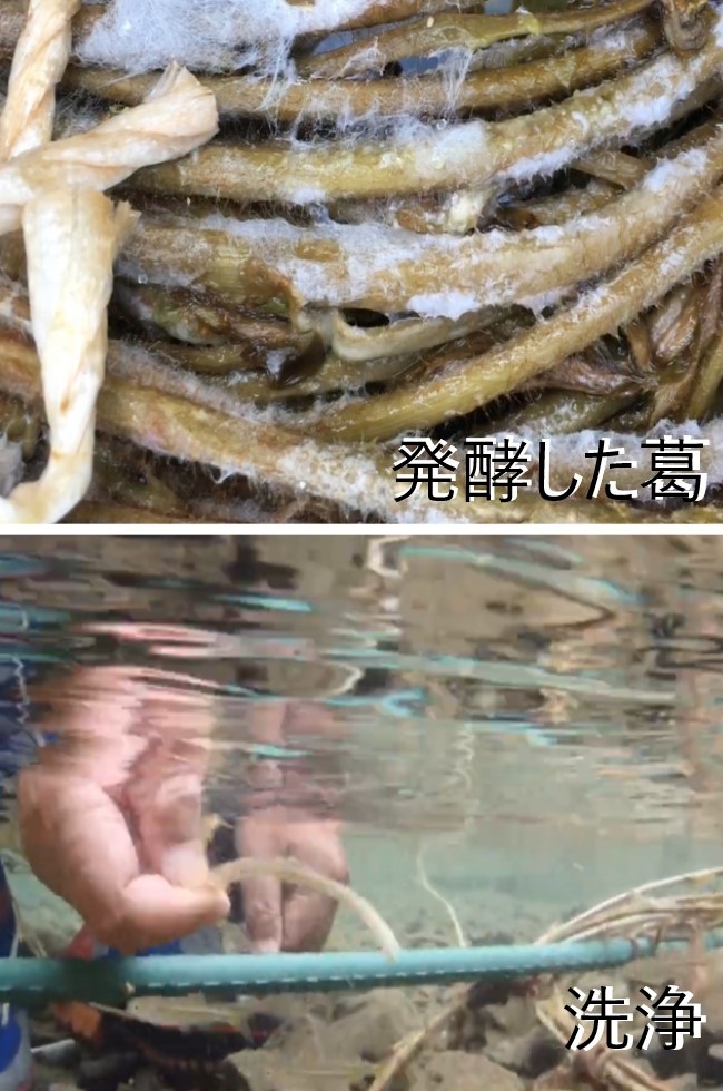 ③川の水で洗い、灰汁や余分な皮を丁寧に取り除きます。このとき水質はとても重要で、澄んだきれいな水でなければ光沢を失い、美しい葛糸には仕上がりません。
