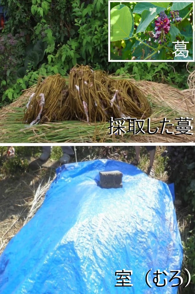 ②ススキなどの色素の出にくい草を敷き、その上に煮沸した葛を並べます。更にススキをかぶせシートで覆います。これを室(むろ)入れといいます。ススキには、枯草菌が含まれ葛の発酵を促す効果があるとされています。時期によって異なりますが、4,5日ほど寝かせ、頃合いを見て室から出します。