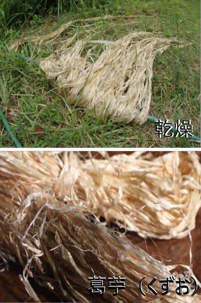 ➃洗い上げた葛を草の上に広げ、天日で乾燥させます。太陽と草の力を受け、葛はやがて白くよみがえります。このようにして得られる白く乾いた繊維を「葛苧(くずお)」と呼びます。