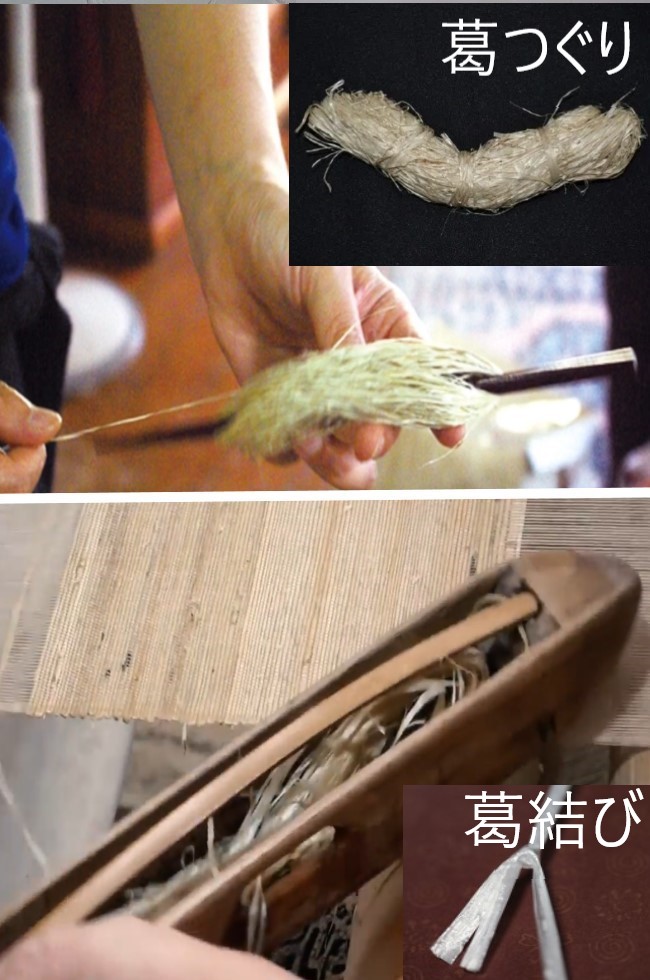毎年、梅雨が終わる頃になると、糸作りが始まります。200g(帯一本分)ほどの繊維をとるには、10kg以上の生葛が必要で、他の自然布と同様に途方もない時間をかけて糸が作られます。