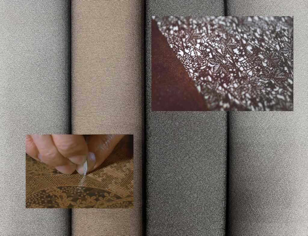 江戸小紋は、細かな模様を彫り込んだ型紙を反物の上に置き、糊置きをしてから引き染めを行います。型を彫る職人と、染めを担う職人、双方に高度な技術が求められる、まさに伝統工芸の粋といえる染め物です。