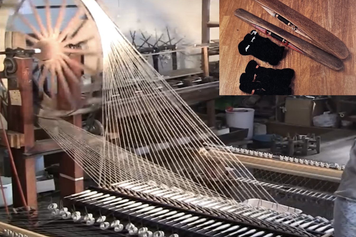織りの工程では、右撚りと左撚りの緯糸を交互に織り込みながら進めます。撚りの向きを間違えないよう、大杼(おおひ)と糸には識別用の色が付けられています。